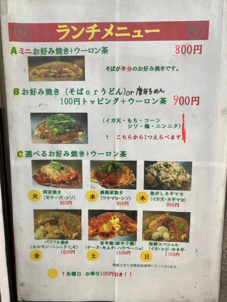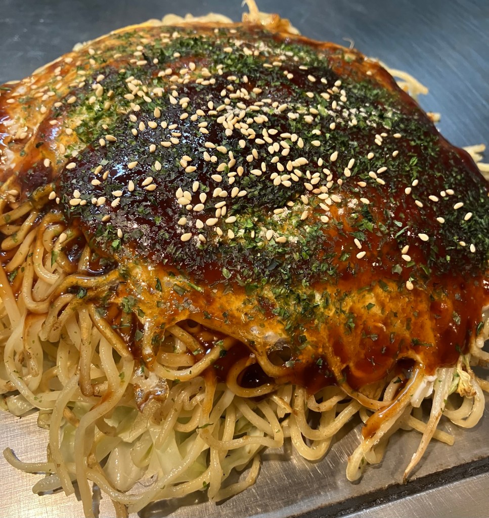 JR広島駅北口から徒歩10分、約600m。今回はランチBセットの餅に、そばWのトッピング。巨大なお好み焼きが美しいです。ふわふわタイプのお好み焼きの中にある餅がさらに美味しい。マヨネーズをたっぷりかけて食べるのが、私は好きです。